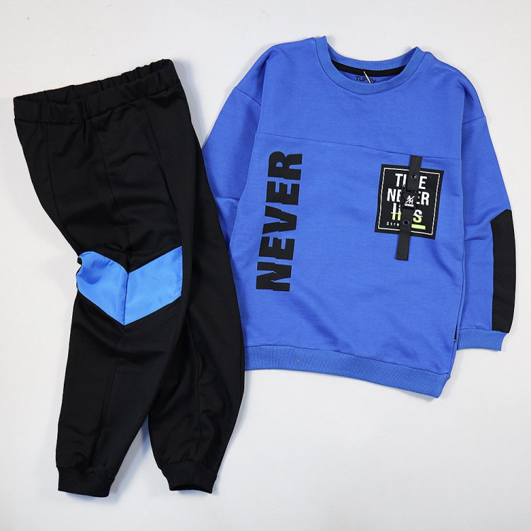 Стильный и комфортный комплект для мальчика Tuffy, состоящий из свитшота и брюк. Выполнен из мягкого трикотажного полотна синего цвета. Идеальный выбор для повседневной носки, активных игр и прогулок. Комплект представлен в размерах 30/116 - 34/134.