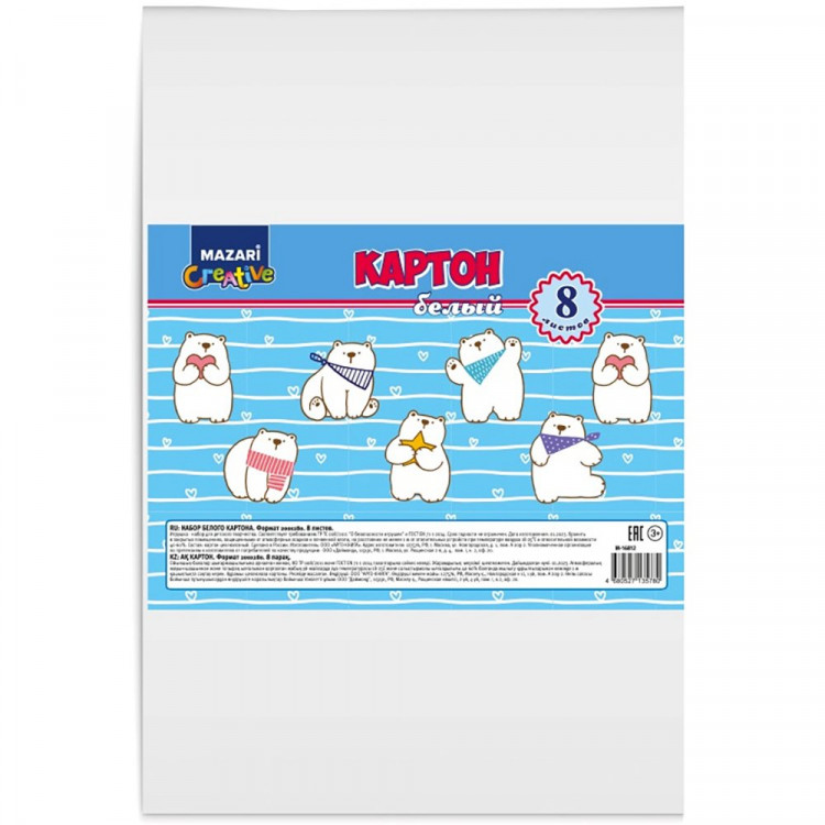 Белый картон А4 8 листов немелованный односторонний (Mazari) 200 г/м2 арт.M-16812
