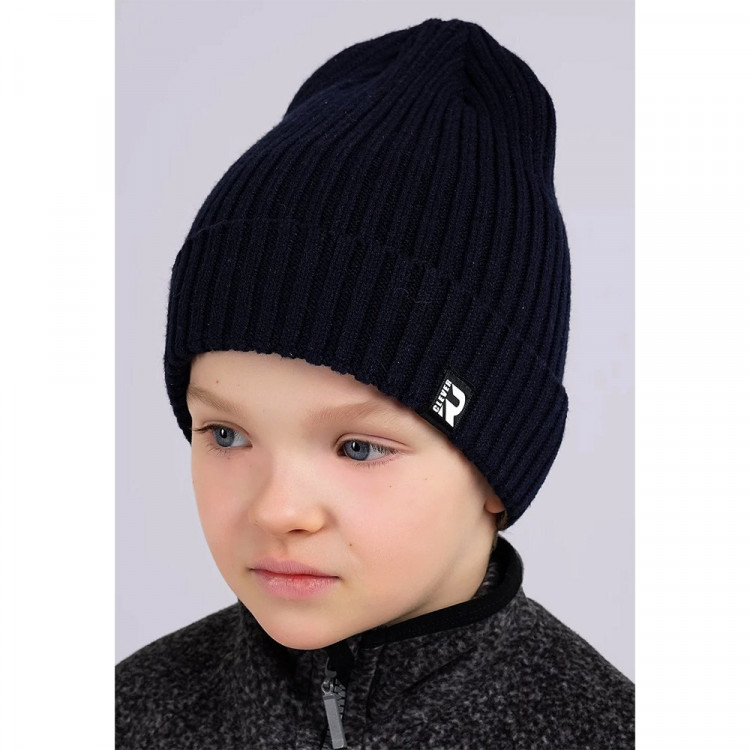 Детская шапка "бини", выполнена ластичным переплетением, декорирована стильной нашивкой. Шапка по голове с небольшим двойным отворотом, за счет которого можно регулировать глубину шапки.