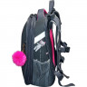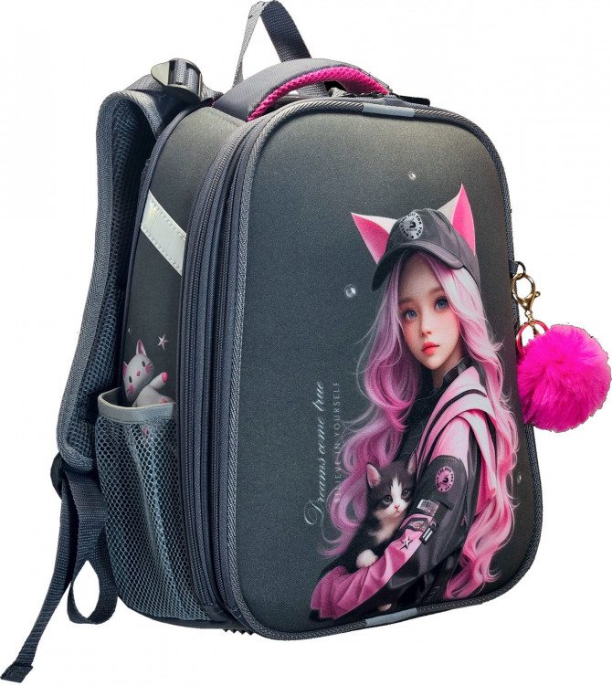 Ранец изготовлен из формованного EVA-материала и высокопрочного непромокаемого полиэстера. Размер 30 х 38 х 16 см. Вес 900 г. Прочные формованные стенки и дно ранца позволяют надежно защитить содержимое от влаги, загрязнений и предотвращают его замятие. Ранец с двумя вместительными отделениями, закрывающимися на реверсивную пластиковую молнию с металлическими «бегунками»; в первом — «плавающие» перегородки для тетрадей и учебников, во втором – большой карман из сетки и карманы-органайзеры для канцелярских принадлежностей. Плотная спинка с анатомическими элементами дополнительно укреплена пластиком, сверху – дышащая трехслойная сетка. Лямки-маечка плотные, мягкие. Регулируются по длине и высоте, что позволяет без труда отрегулировать их по росту ребенка. Ранец снабжен надежным нагрудным фиксатором и двумя боковыми карманами из прочной сетки. Есть удобная мягкая ручка для переноски и дополнительная петлевая ручка для размещения ранца на крюке. На дне ранца есть две пластиковые ножки. В соответствии с требованиями к безопасности на дороге, ранец имеет светоотражающие элементы на лямках и корпусе.