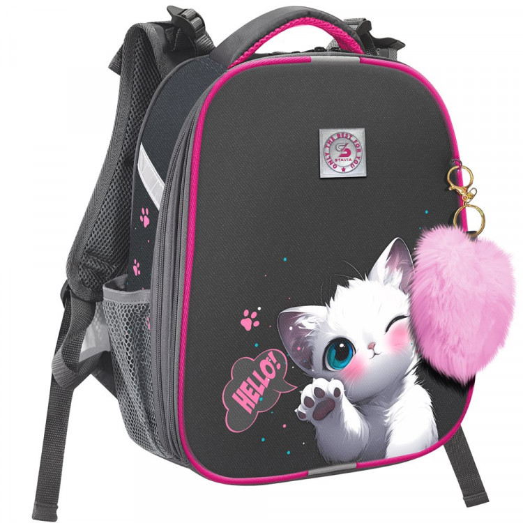 Ранец изготовлен из формованного EVA-материала и высокопрочного непромокаемого полиэстера. Размер 30 х 38 х 16 см. Вес 900 г. Прочные формованные стенки и дно ранца позволяют надежно защитить содержимое от влаги, загрязнений и предотвращают его замятие. Ранец с двумя вместительными отделениями, закрывающимися на реверсивную пластиковую молнию с металлическими «бегунками»; в первом — «плавающие» перегородки для тетрадей и учебников, во втором – большой карман из сетки и карманы-органайзеры для канцелярских принадлежностей. Плотная спинка с анатомическими элементами дополнительно укреплена пластиком, сверху – дышащая трехслойная сетка. Лямки-маечка плотные, мягкие. Регулируются по длине и высоте, что позволяет без труда отрегулировать их по росту ребенка. Ранец снабжен надежным нагрудным фиксатором и двумя боковыми карманами из прочной сетки. Есть удобная мягкая ручка для переноски и дополнительная петлевая ручка для размещения ранца на крюке. На дне ранца есть две пластиковые ножки. В соответствии с требованиями к безопасности на дороге, ранец имеет светоотражающие элементы на лямках и корпусе.