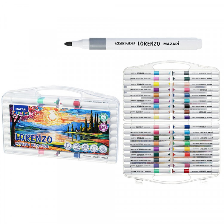 Откройте для себя безграничные возможности для творчества с акриловыми маркерами! Этот набор из 36 ярких и насыщенных цветов станет незаменимым инструментом для художников, иллюстраторов, дизайнеров и любителей скетчинга. Маркеры идеально подходят для создания детализированных рисунков, эффектных надписей и красочных иллюстраций на различных поверхностях: бумаге, картоне, ткани, дереве, пластике и даже камне.