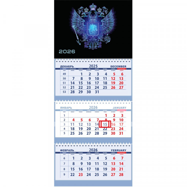 Элегантный настенный трехблочный календарь на 2026 год станет стильным и функциональным дополнением вашего офиса или дома. Календарь размером 295*700 мм украшен строгим и лаконичным изображением герба на черном фоне, что придает ему солидный и представительный вид. Удобная трехблочная структура позволяет видеть сразу три месяца: предыдущий, текущий и следующий, облегчая планирование и организацию. Календарь собран на трех гребнях, что обеспечивает надежность и долговечность использования.